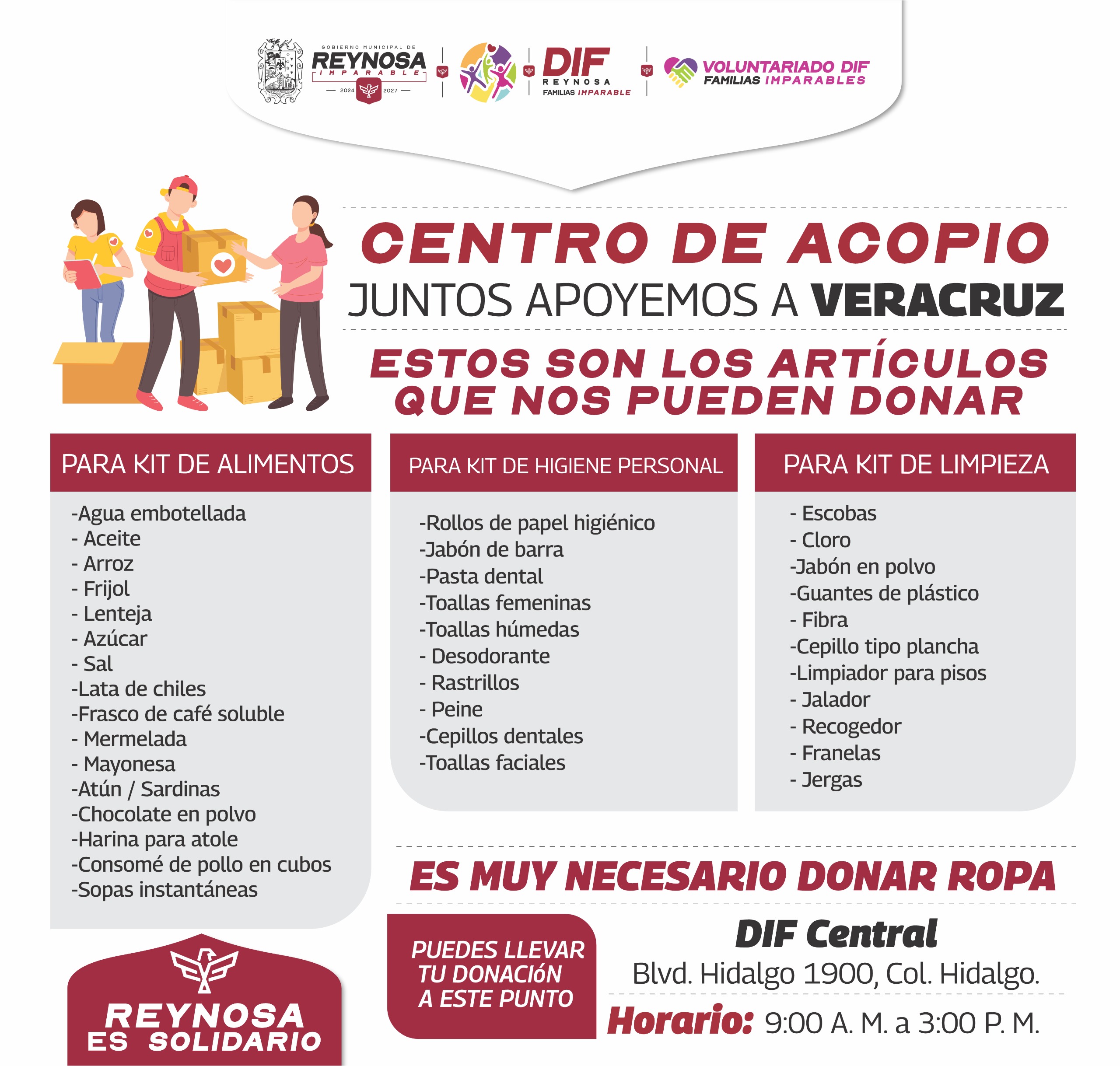 Por instrucciones del Alcalde, Carlos Peña Ortiz, a través del Sistema DIF-Reynosa, que preside Carlos Luis Peña Garza y el Voluntariado que encabeza Alejandra Yelitza Garza, se instaló un Centro de Acopio con el propósito de reunir ayuda humanitaria destinada a las familias afectadas en el estado de Veracruz.