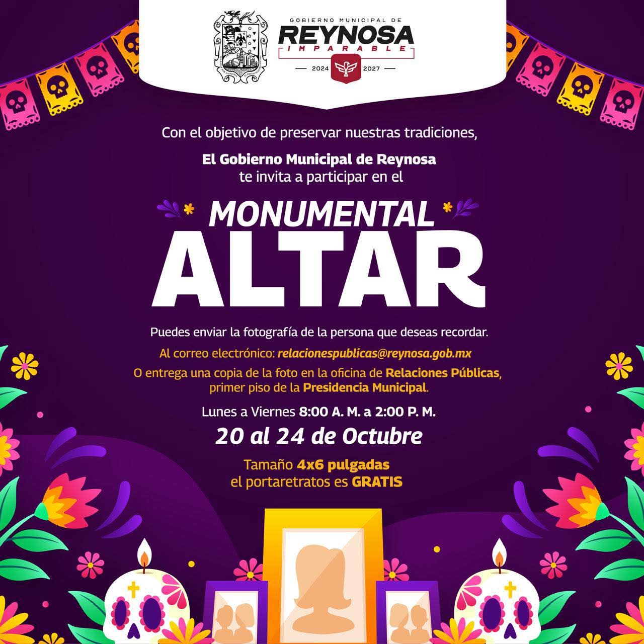 El Presidente Municipal Carlos Peña Ortiz invita a la comunidad a ser parte de la preservación de las tradiciones nacionales, en el Monumental Altar, de la plaza principal Miguel Hidalgo de Reynosa, con el que se celebra a quienes ya no están físicamente con nosotros.