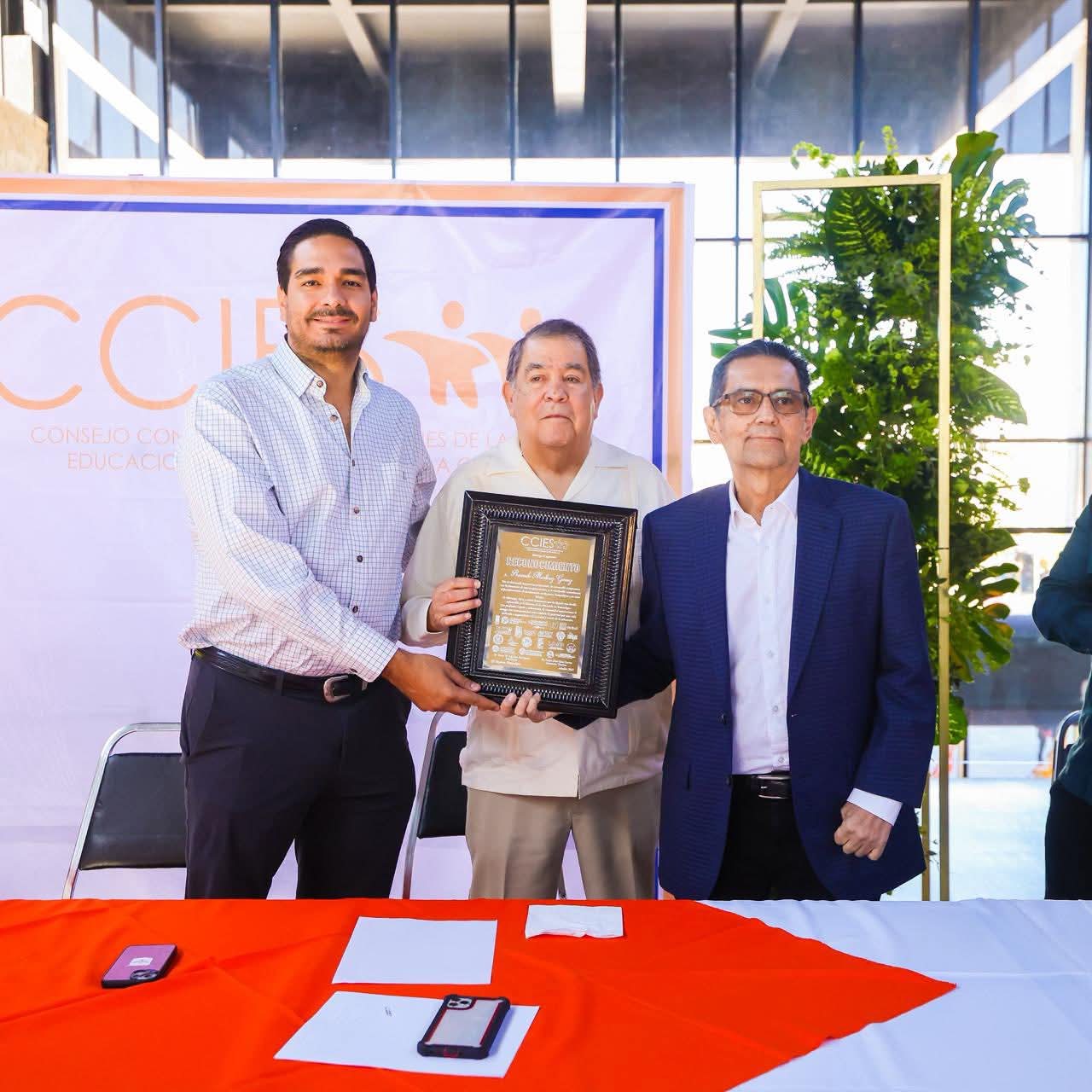 Como Presidente del Consejo, CCIES, el Doctor Oscar W. Aguilera, dio la bienvenida y apertura de la Sesión y junto al Alcalde y los Rectores, Directores y administrativos de Colegios y Universidades entregó el reconocimiento al gran visionario, impulsor de la educación en Reynosa, Mtro. Rosendo Martínez Gómez