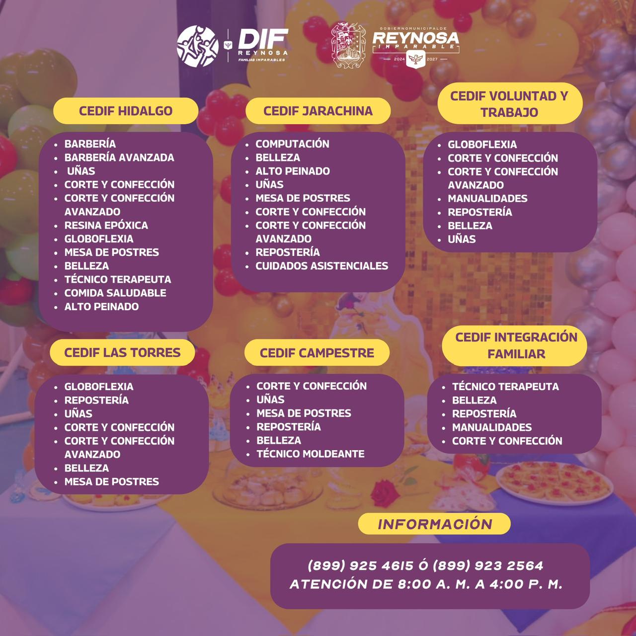 El Sistema DIF Reynosa, presidido por Carlos Luis Peña Garza, invita a la ciudadanía a aprovechar los espacios disponibles en los talleres CEDIF, con el objetivo de generar emprendimientos y mejorar la calidad de vida.