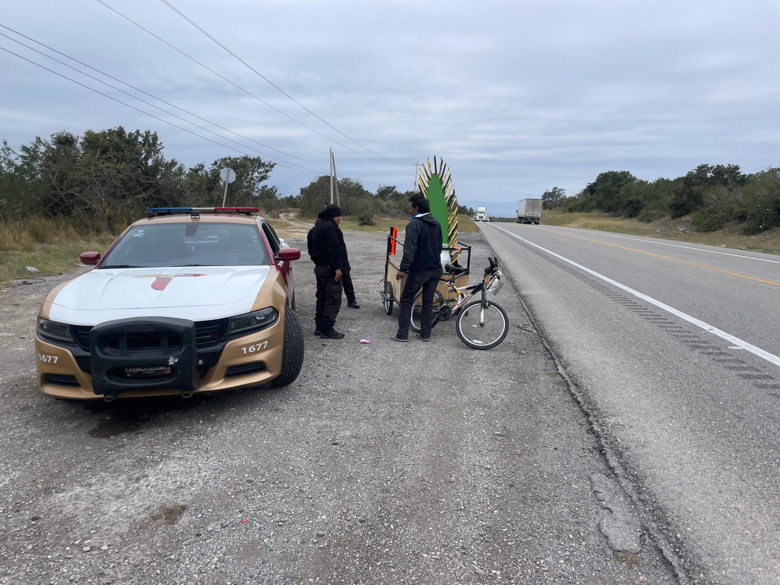 González, Tamaulipas.- En atención a un reporte del C5 personal de la Guardia Estatal de Apoyo Carretero comisionado a la Estación Segura Escandón se trasladó al kilómetro 35 de la Carretera Federal 81 para asistir al ciclista que viajó desde Reynosa hasta el municipio de Hidalgo a bordo de una bicicleta tricarga.