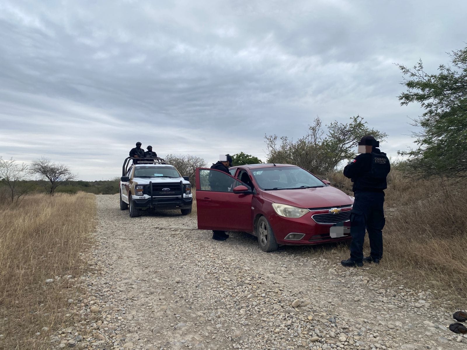 González, Tamaulipas.- Al realizar recorridos de seguridad y vigilancia en el ejido Nuevo Quintero, personal de la Guardia Estatal perteneciente a la Coordinación Municipal González, visualizaron un vehículo varado en la brecha que conduce a la Carretera Estatal 116.