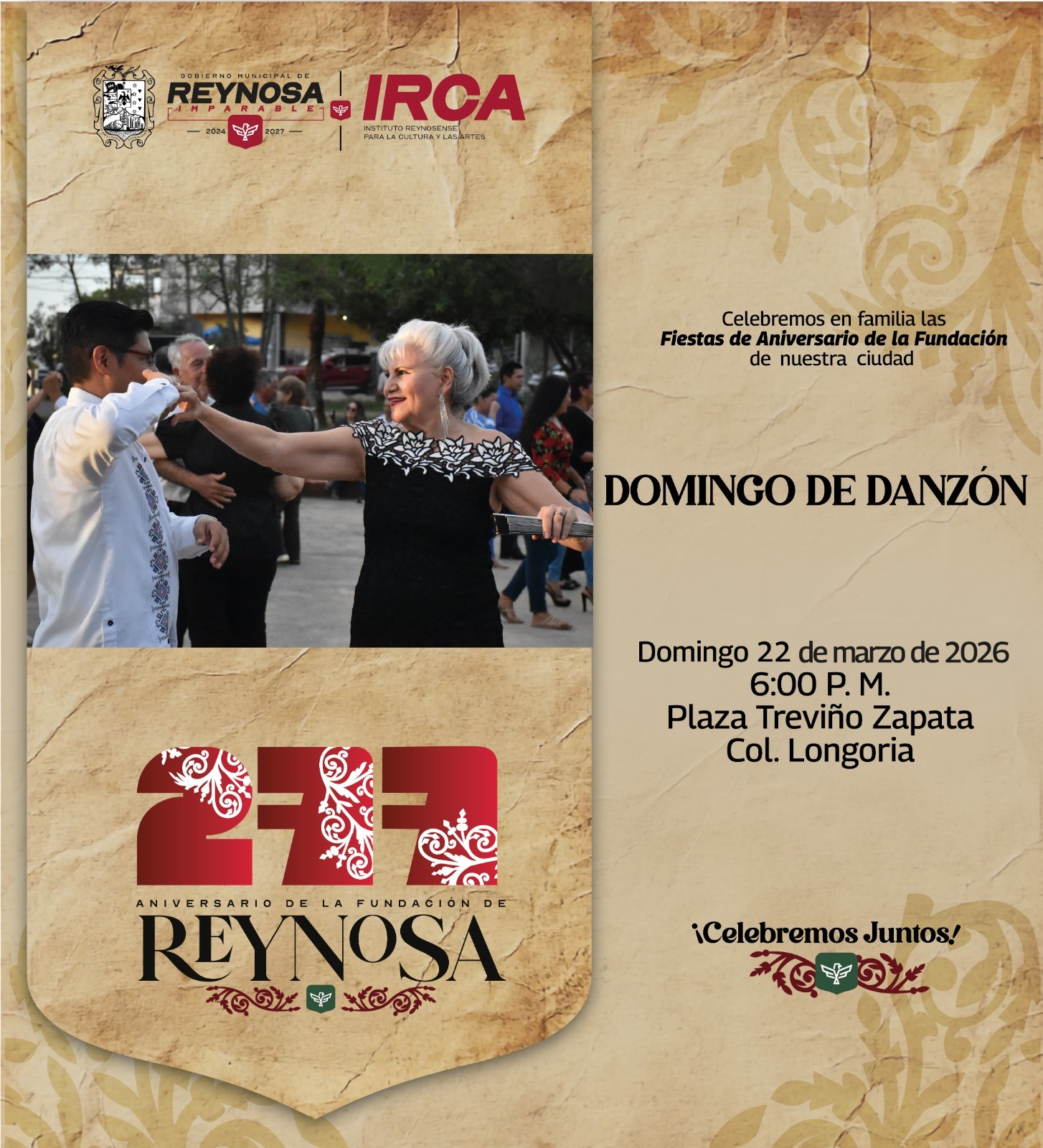 El Gobierno de Reynosa, que preside el Alcalde Carlos Peña Ortiz, invita a disfrutar de la cartelera de eventos que ha organizado el Instituto Reynosense para la Cultura y las Artes con motivo del 277 Aniversario de la Fundación de nuestra ciudad.